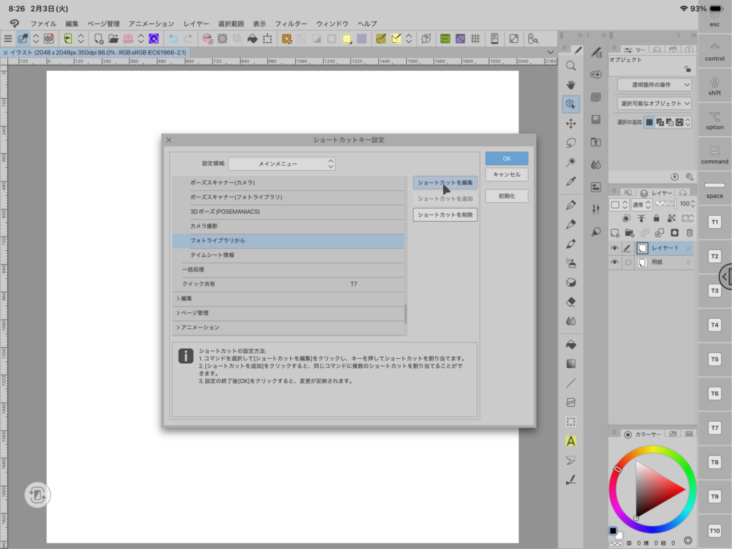 例えば「T4」のエッジキーボードボタンに複数ページの漫画作業での「次のページへ」移動するショートカットを置いているのですが、修飾キー+T4のショートカットキーにはページ移動に関連するショートカットを設定しました。