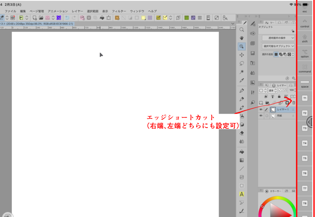 趣味でclip studio paintを使っているのですが、ipad版ではエッジキーボードという画面の端っこの方にボタン群を出すことができます。