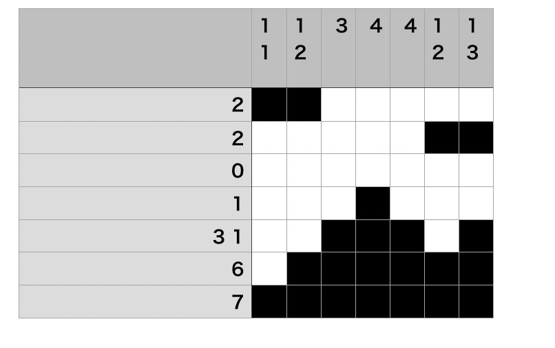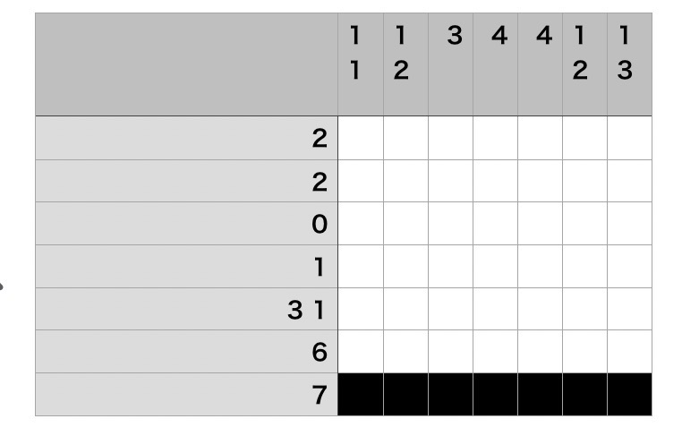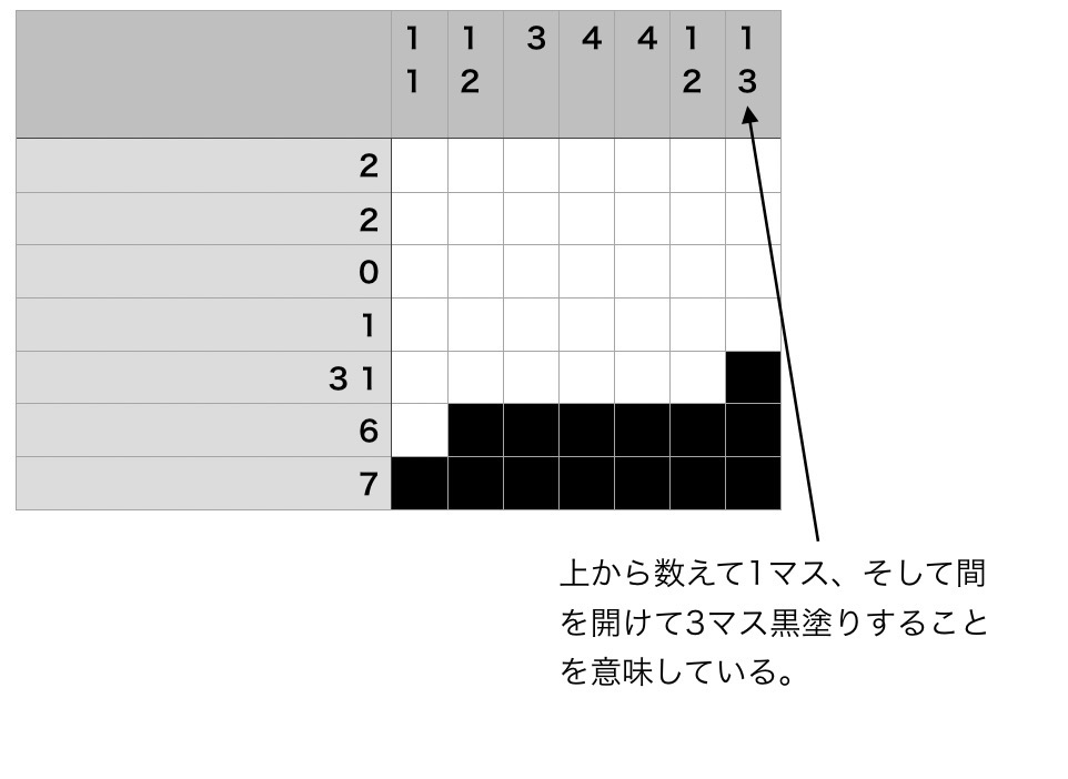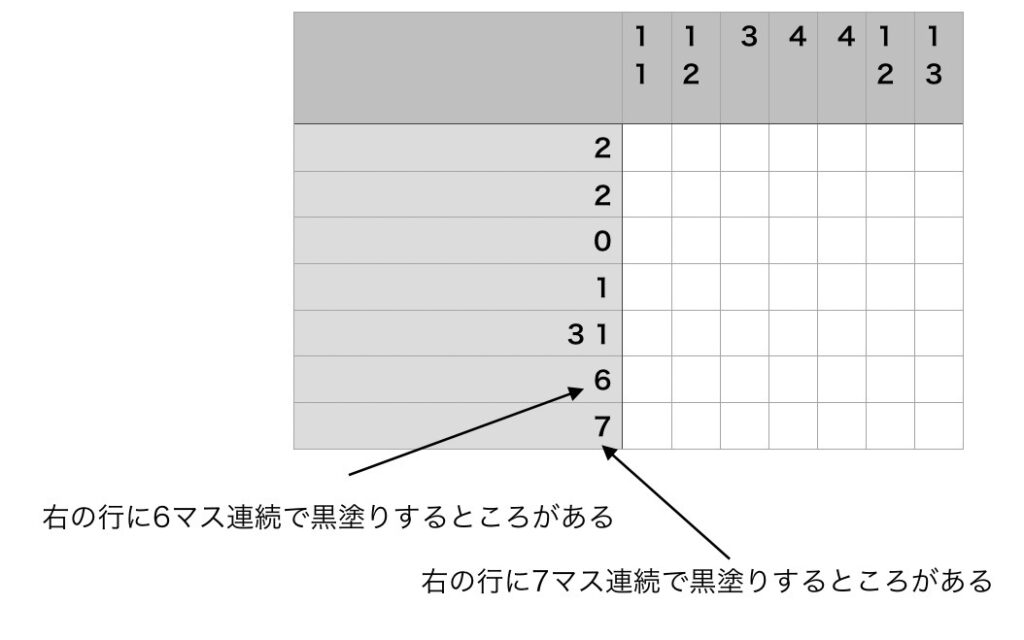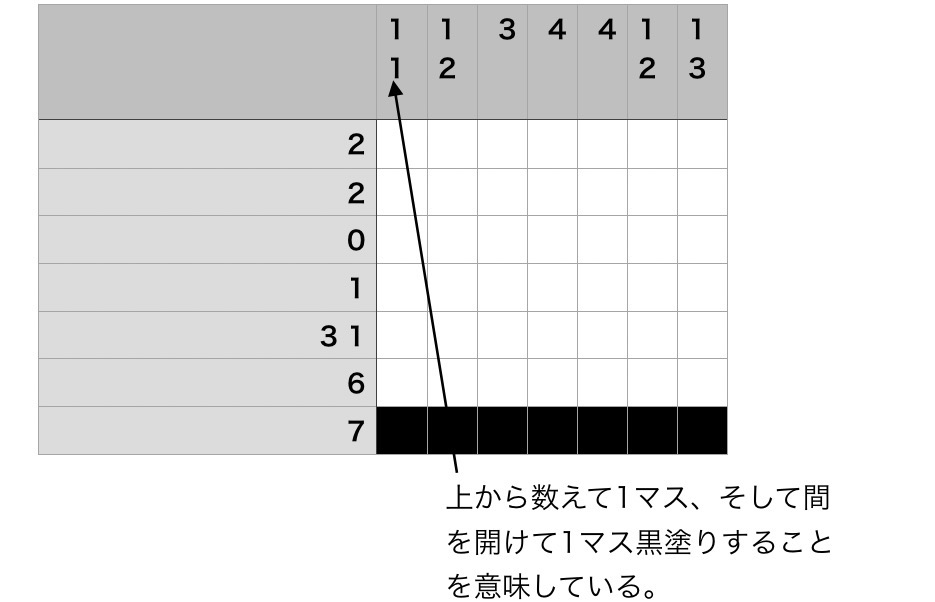 ②例えば右の1番下の7は1番下の行を「7マス連続で黒塗りすることを意味」していて、下から2番目の6は下から2番目の行を「6マス連続で黒塗りすることを意味」している。
