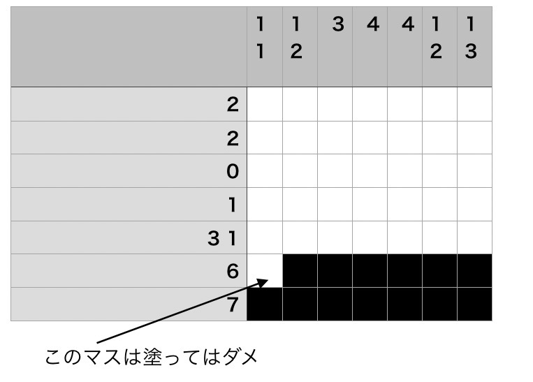 つまり左側の一番下のマスをすでに黒塗りしているから、1マス空けなければならない。